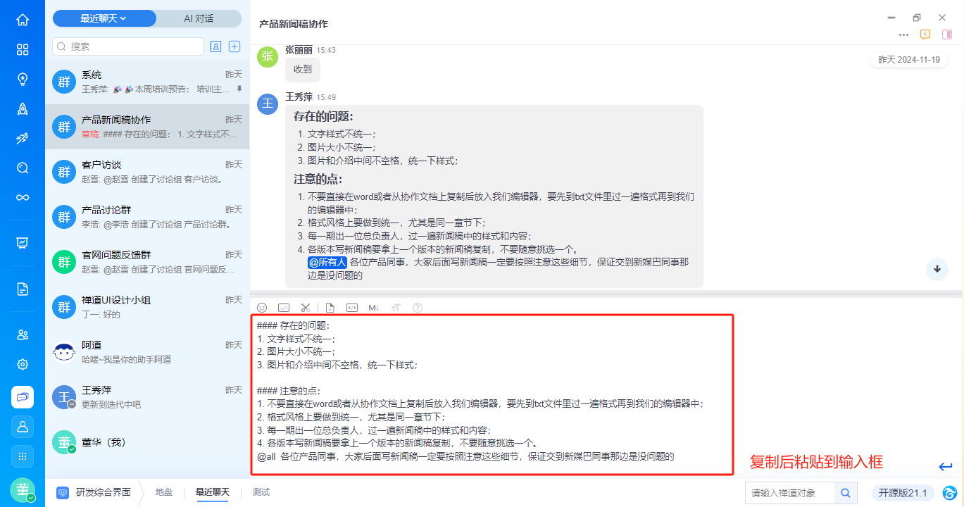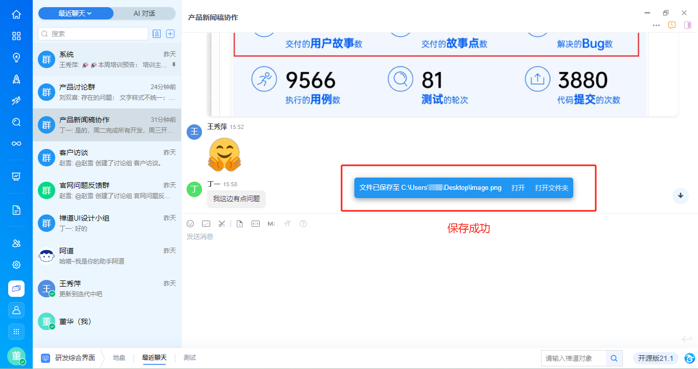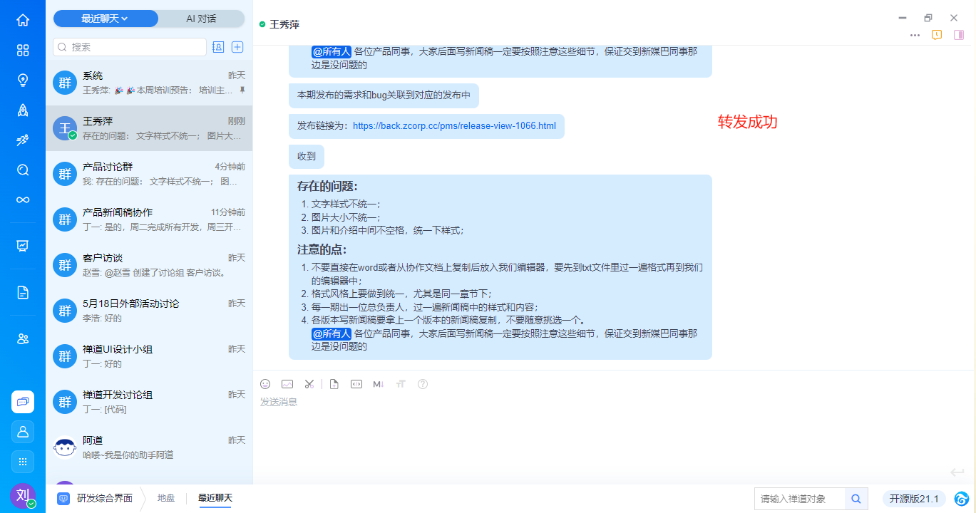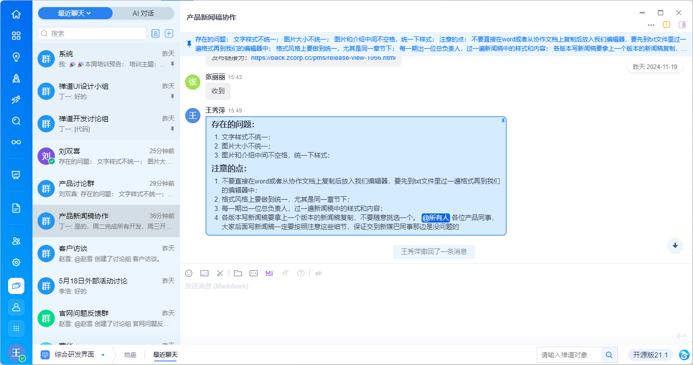 - 支持基于消息内容右键新建需求、任务、bug、待办,与禅道进行高效协同,具体功能请见手册《基于对话消息创建禅道对象》。