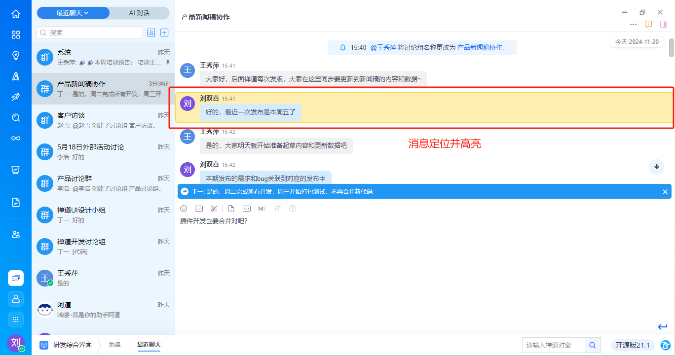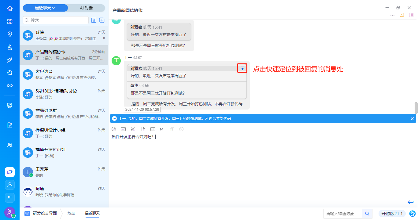 - 支持消息回复,将以消息串的形式展现,并支持点击快速定位到被回复的消息处,帮助用户追溯和获取语境。