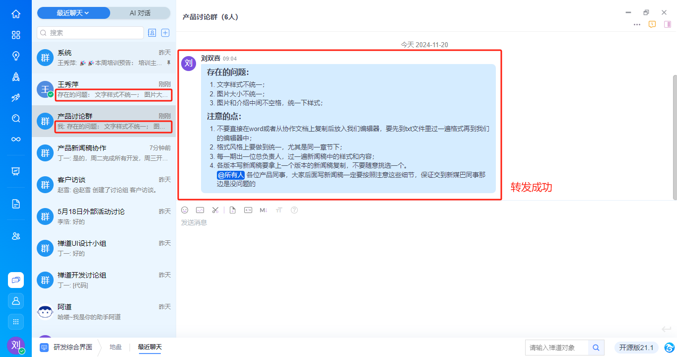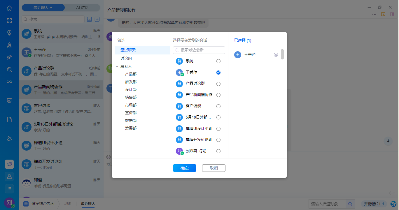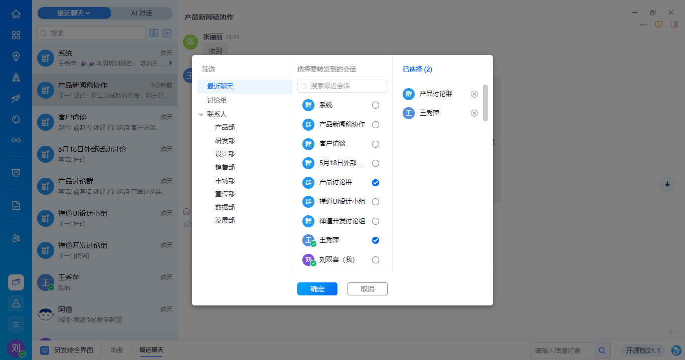 - 支持消息转发,点击后支持选择对话并发送。