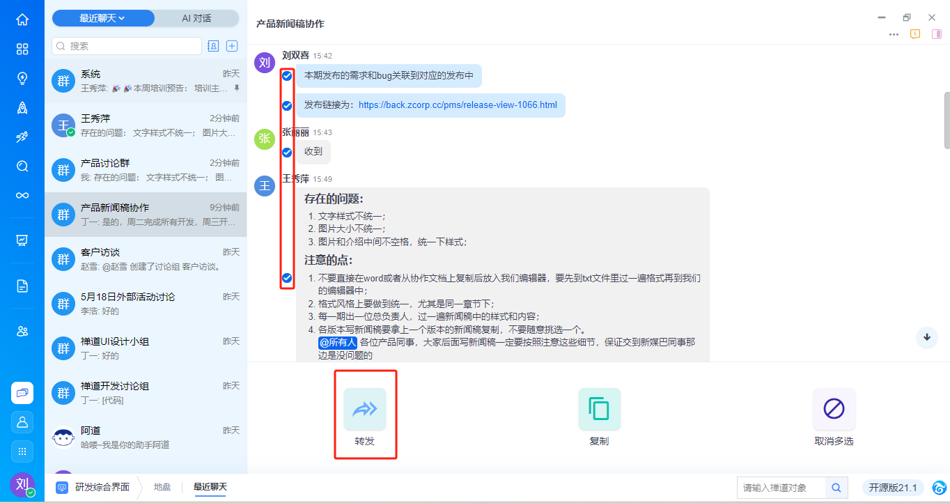 - 支持批量选中消息后,转发到其他会话。