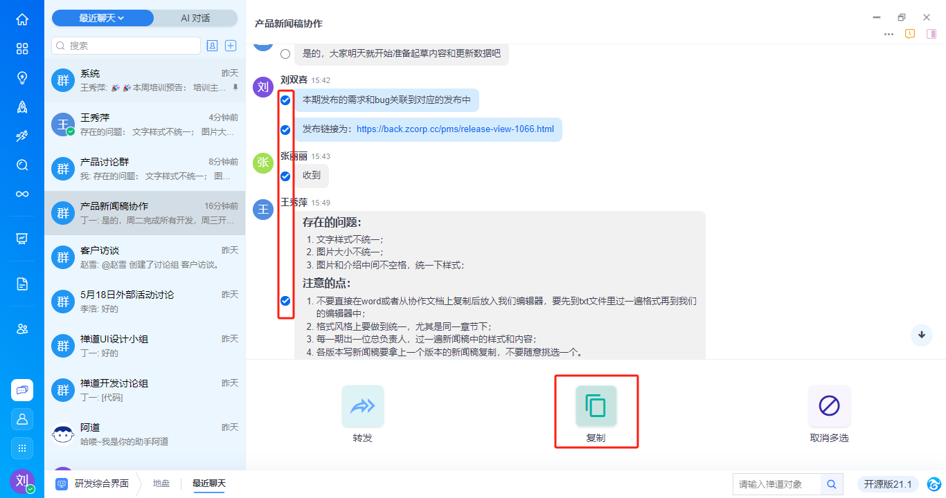 - 支持批量选中消息后复制。