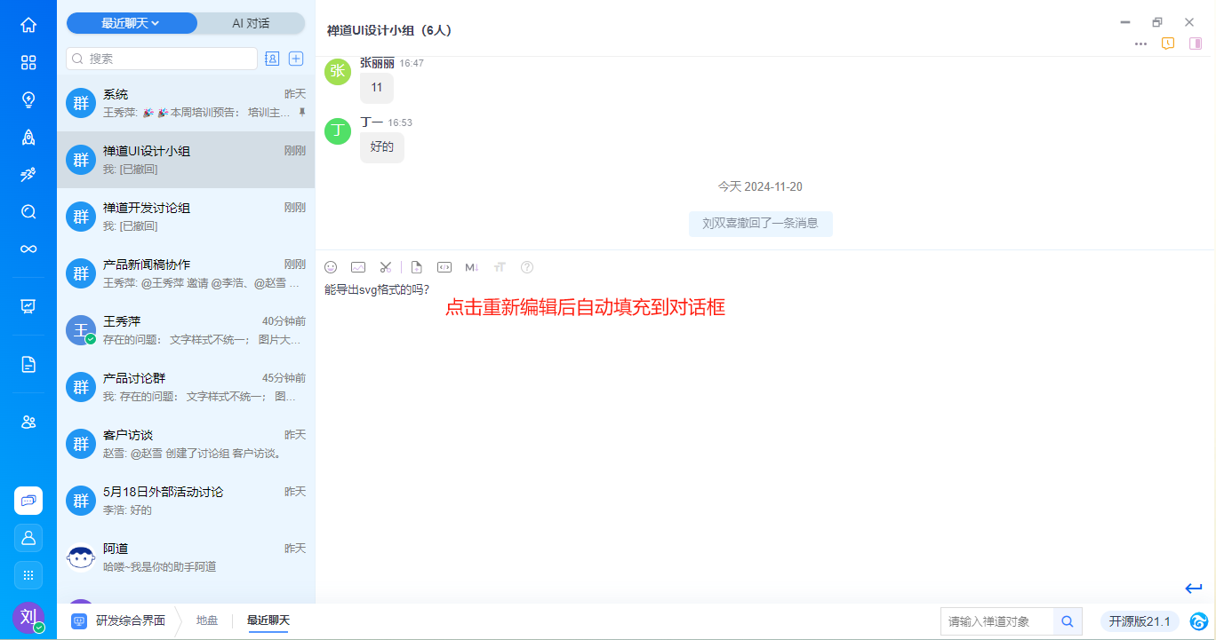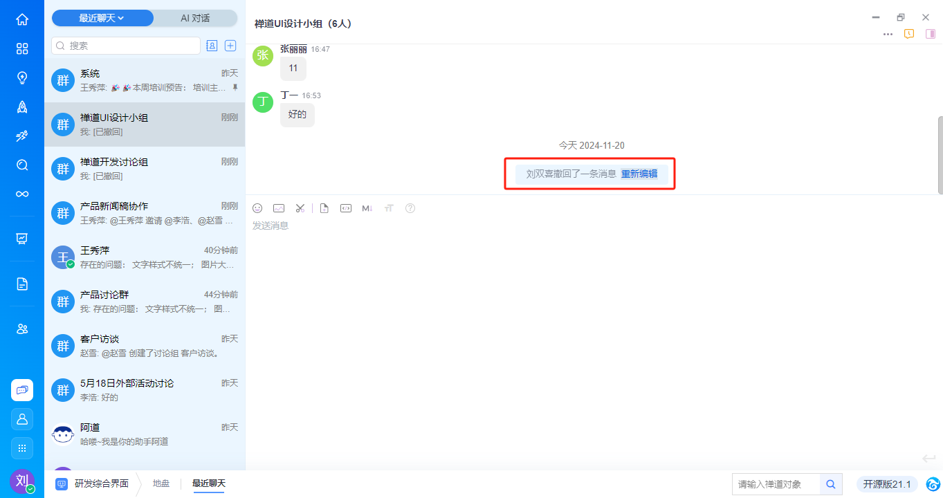 - 支持撤回2min之内发出去的消息,撤回的消息支持快速再次编辑。