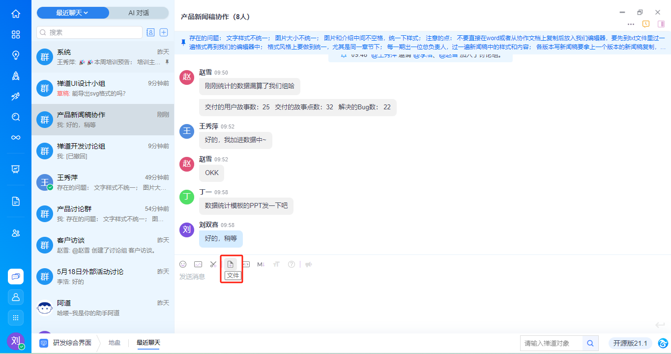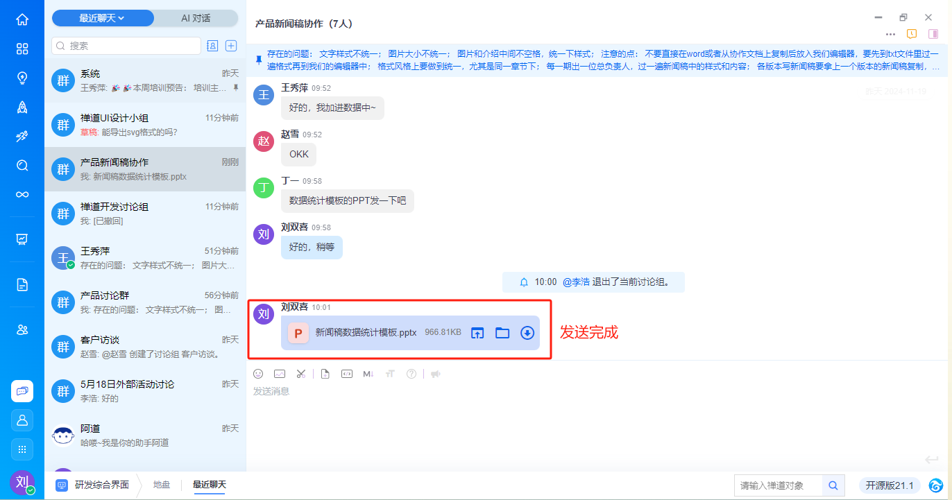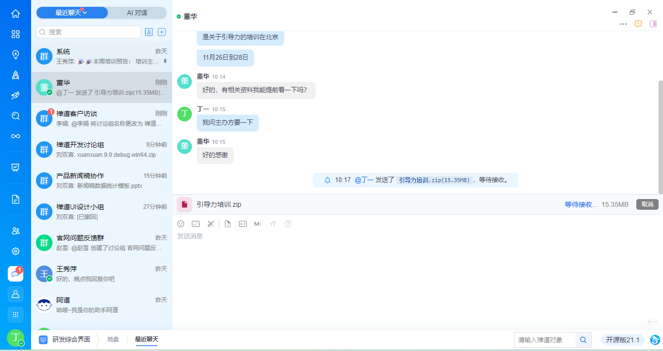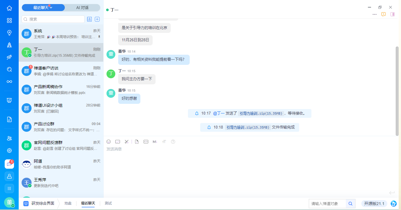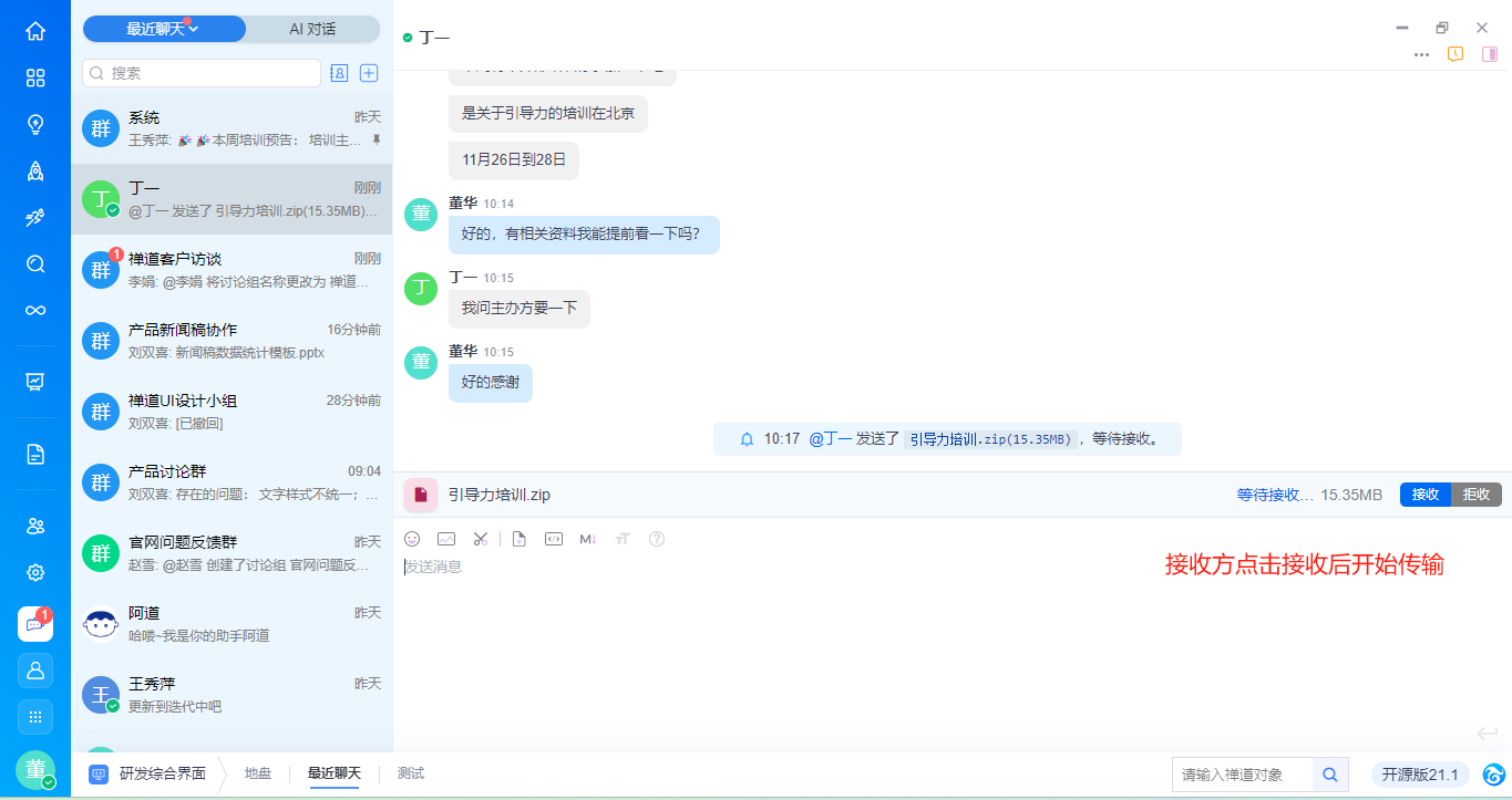 - 支持在讨论组和一对一会话中传输和接收文件、压缩包。