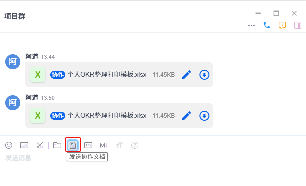 支持Word、Excel、PPT协作功能,将本地文件以协作文档的方式共享到会话中,支持文档的实时保存。文档协作能力同样基于Collabora Office的授权,请先联系技术人员获取。