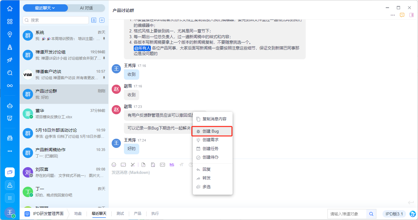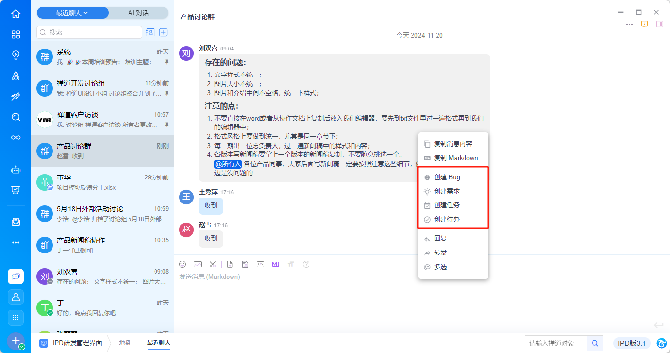 禅道大桌面中右键对话消息支持直接直接创建禅道Bug、需求、任务、文档、待办。