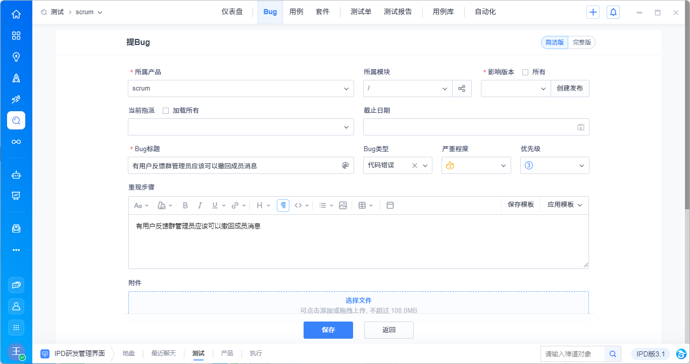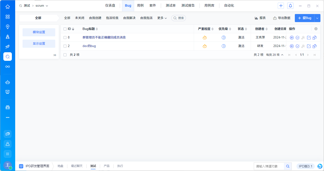 创建成功的Bug会记录在禅道界面中。