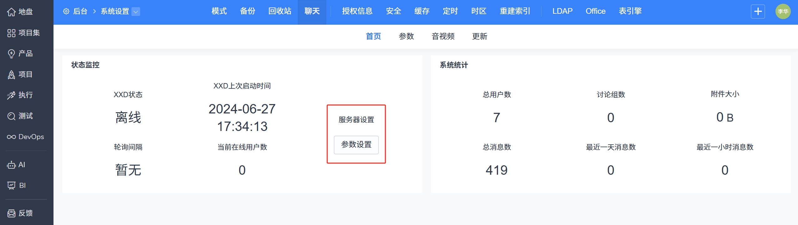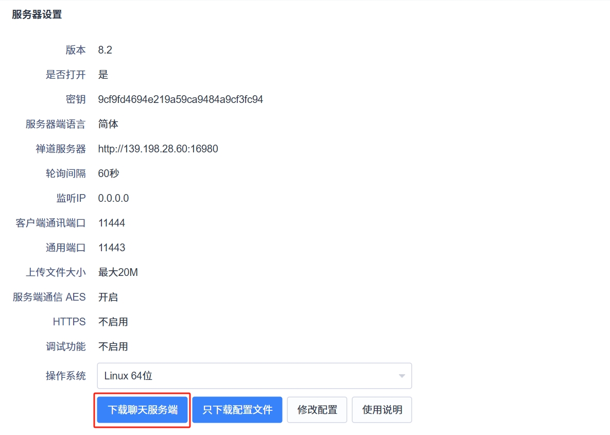 - Linux 一键安装包安装的禅道,可以在禅道“后台”-“聊天”-“参数设置"中只下载配置文件xxd.conf,然后覆盖原目录里的 /opt/zbox/run/xxd/config 即可。