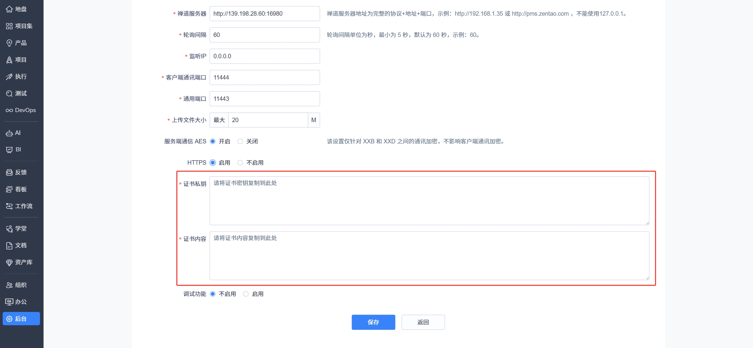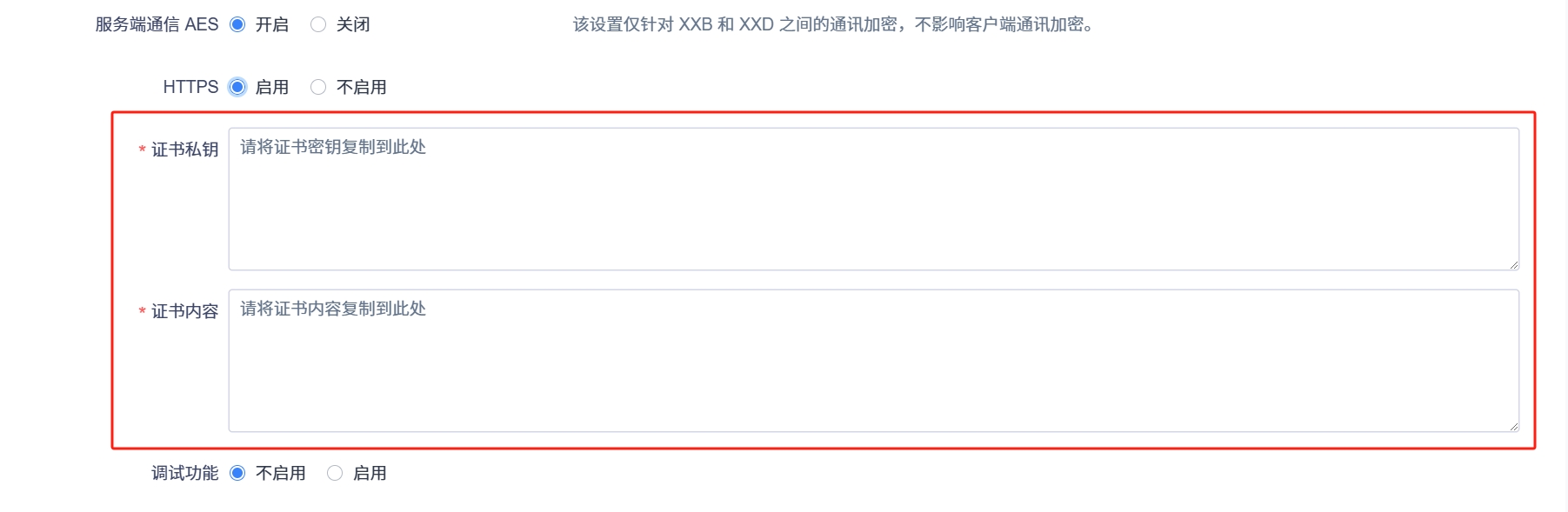 是否启用https,默认是不启用。启用后,需要把https证书的内容和密钥复制粘贴到输入框了。