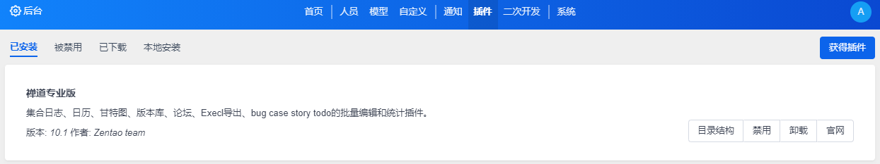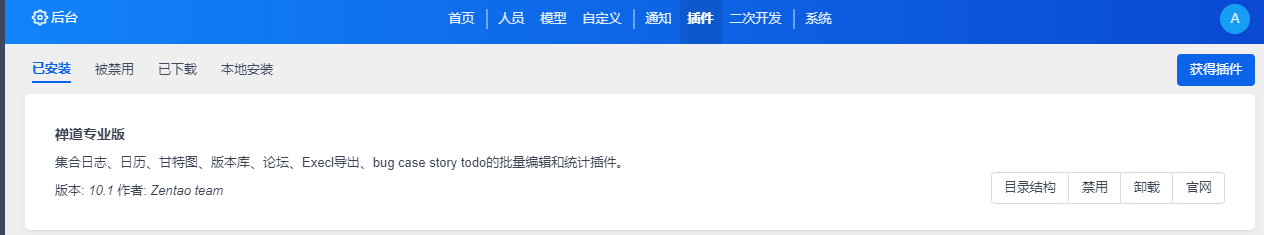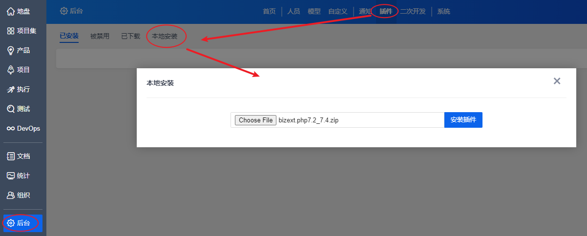 1、使用管理员登录禅道,进入“后台”-“插件”-“本地安装”。选择专业版插件(联系客户人员获得相应版本的专业版插件包)。