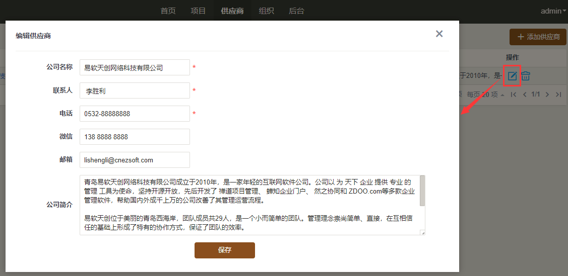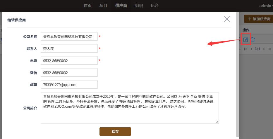 点击供应商列表页面右侧操作栏里的操作按钮,可以对供应商进行编辑和删除操作。