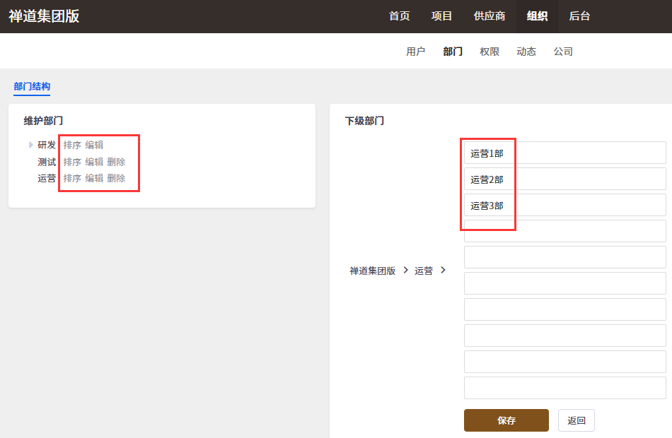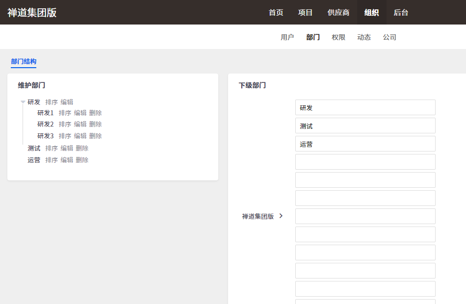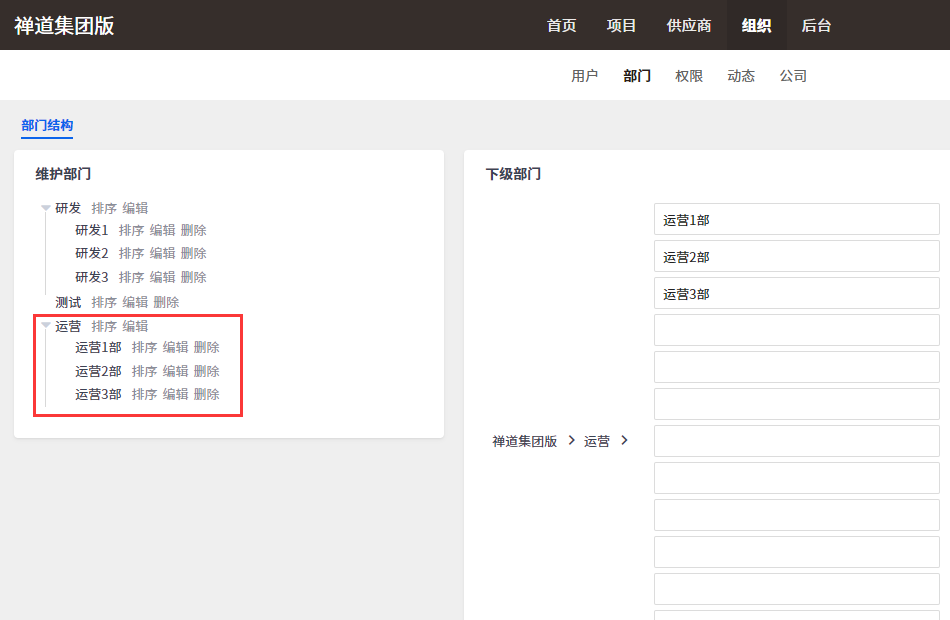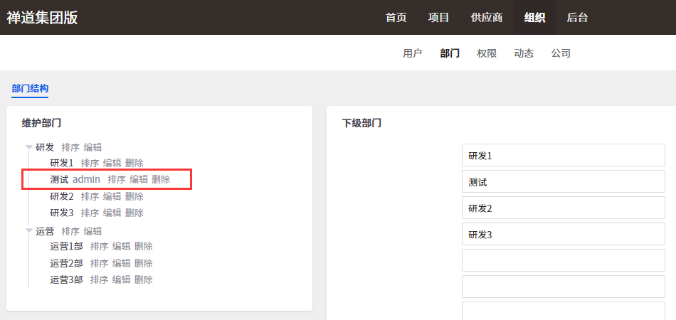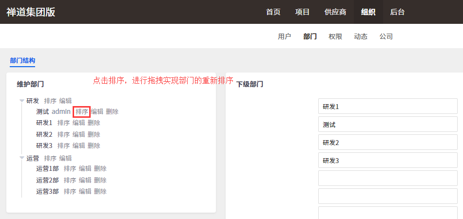 也可以点击部门名称后面的 操作按钮,对部门进行排序、编辑、删除操作。