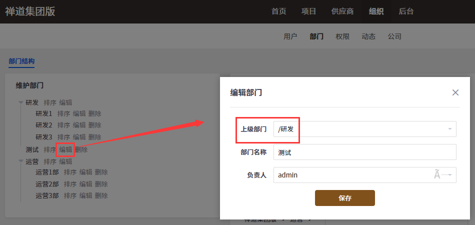 编辑可以修改部门的所属关系,设置部门的负责人信息。