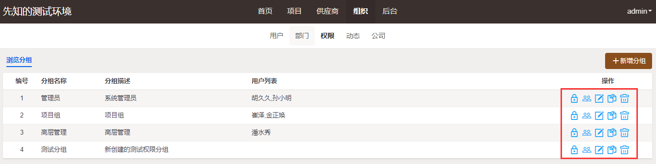 权限分组列表页面右侧的操作栏里,可以对分组进行编辑和删除操作,见下图红框位置。