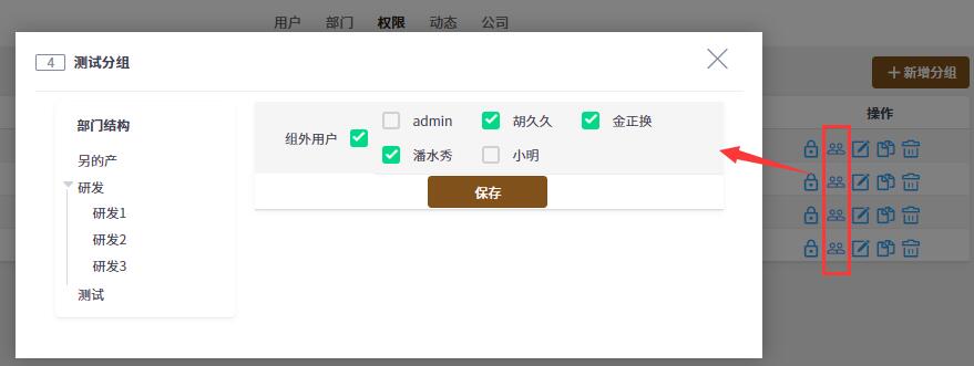 点击分组列表右侧的 权限维护 图标,下图红框位置,即可进入权限维护页面。