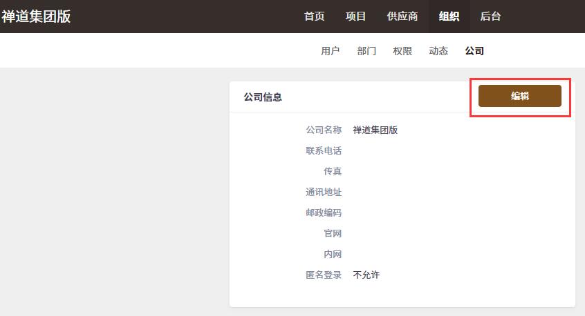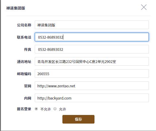 在安装禅道集团版的时候,公司信息只填写了公司名称,可以在这里完善公司的其他信息。