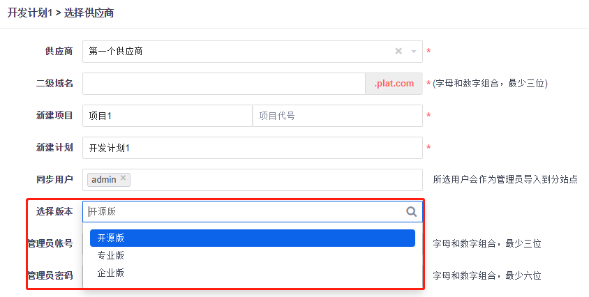 选择了某一个供应商后,页面会弹出子站点的域名创建、关联的项目和开发计划信息。