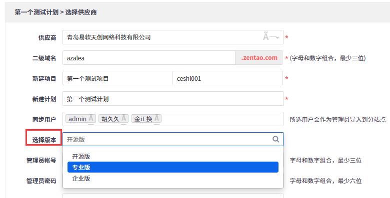 集团版1.1版本开始,创建子站点时,可以选择该子站点使用的禅道版本:开源版、专业版、企业版。