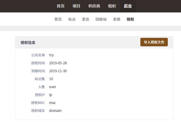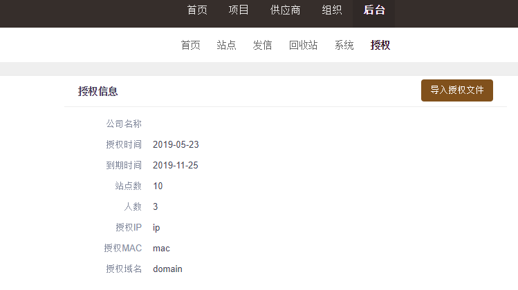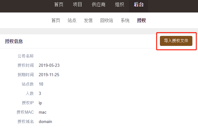 集团版的主站平台和子站点的授权信息都是从主站平台的后台--授权导入的。目前只有超级管理员可以查看和导入授权文件。