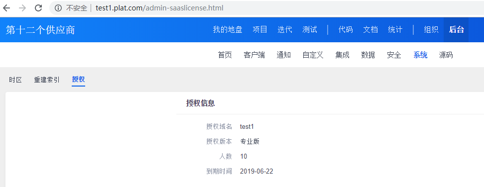 4、集团版1.1版本开始,集团版主站平台和子站点的授权分开。主站平台的授权信息在集团版主站平台的后台--授权里查看,子站点是专业版或企业版的,在子站点的后台--系统--授权里查看。