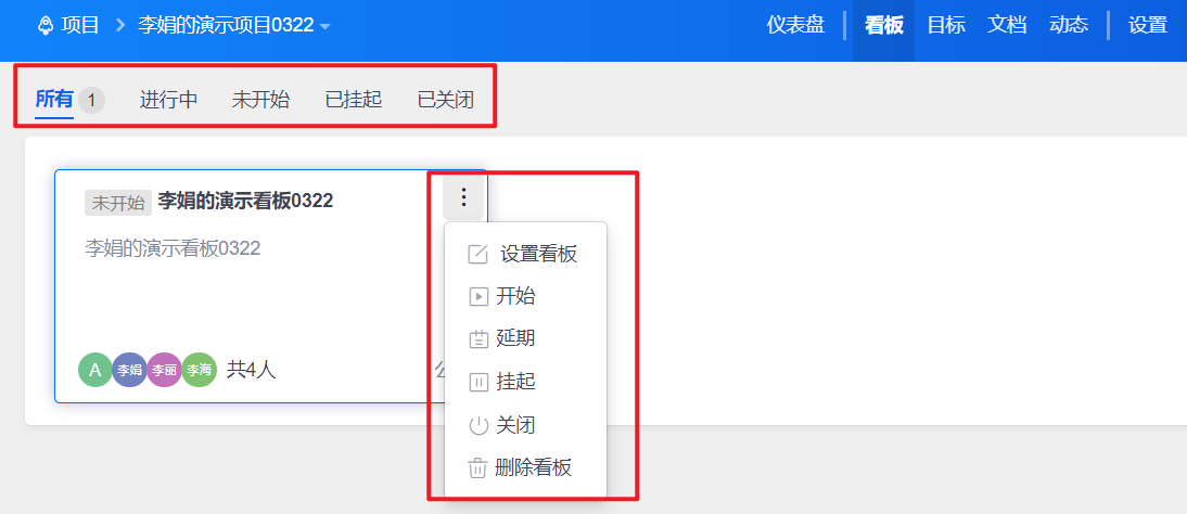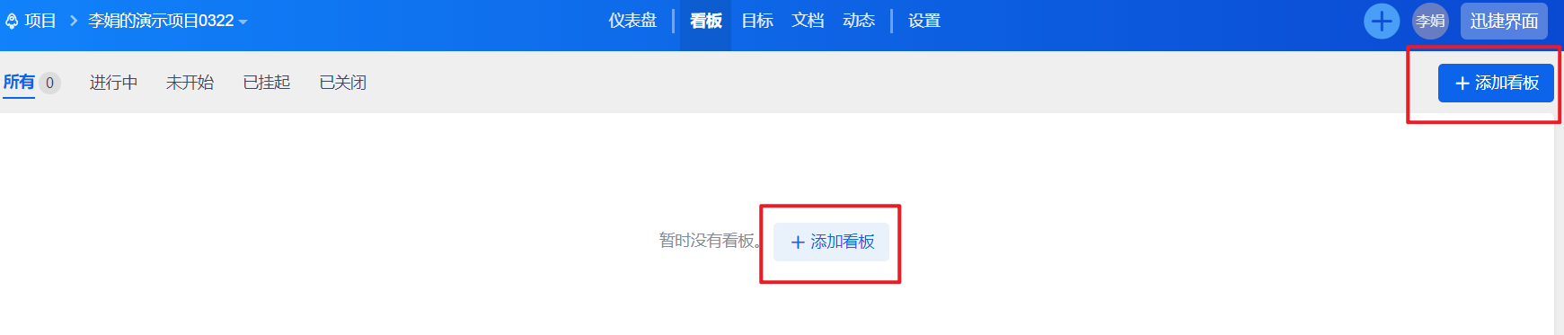 可以通过所有、进行中、未开始、已挂起、已关闭来查看看板。
