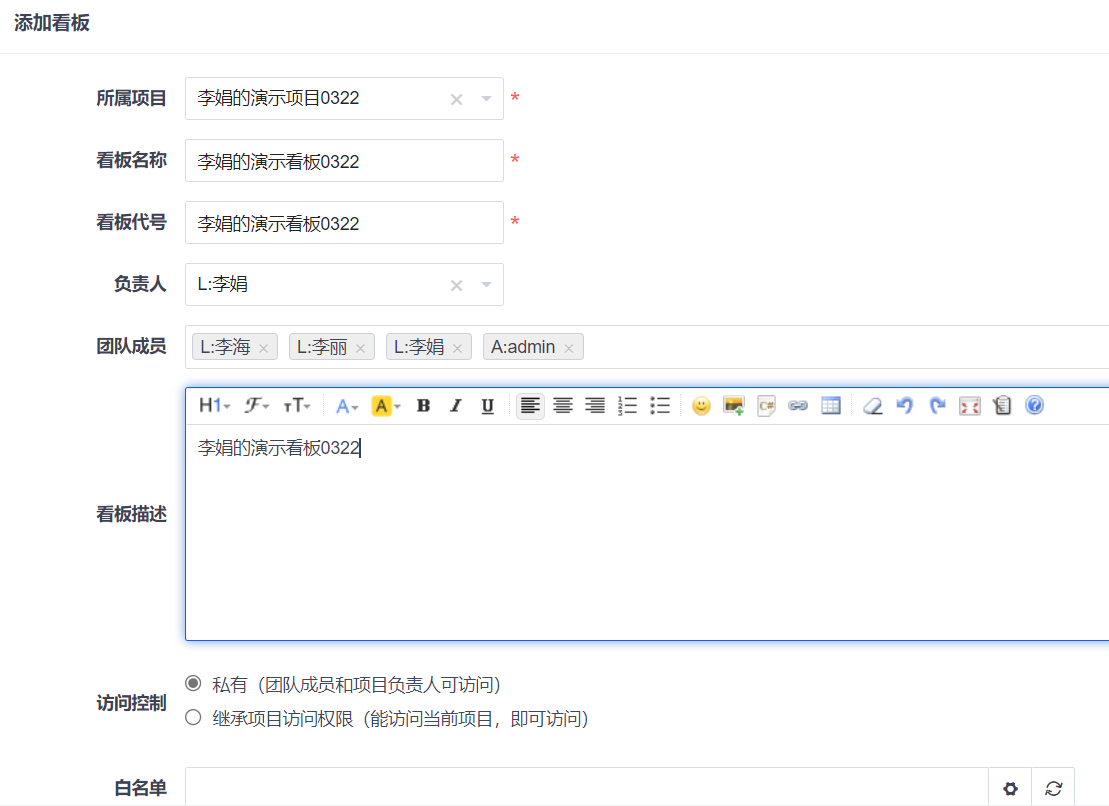 填写看板名称、看板代号、负责人、团队成员、看板描述、访问控制等信息,点击保存即可。
