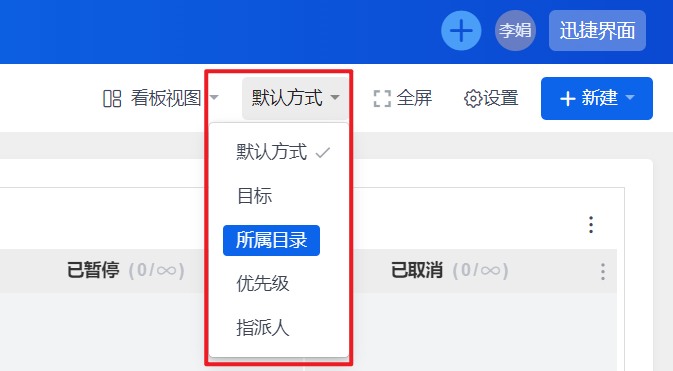 默认方式可以切换到看板任务关联的目标,关联目标的所属目录、优先级、指派人来查看看板信息。