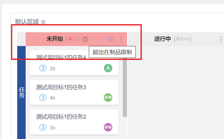 如果看板列的卡片数量超出了在制品数量,会标红显示,并提示超出在制品限制。