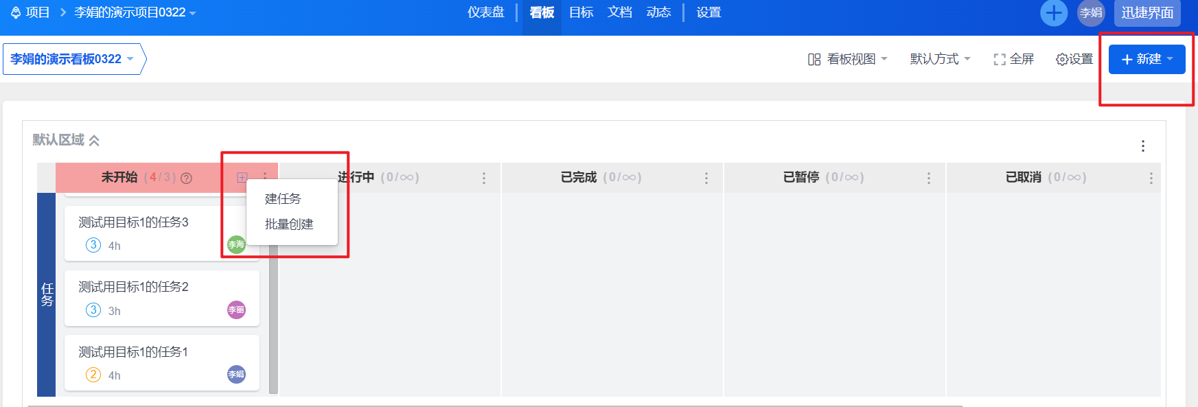 点击看板列右上角的添加任务按钮,点击看板右上角的新建按钮,可以创建和批量创建看板任务。