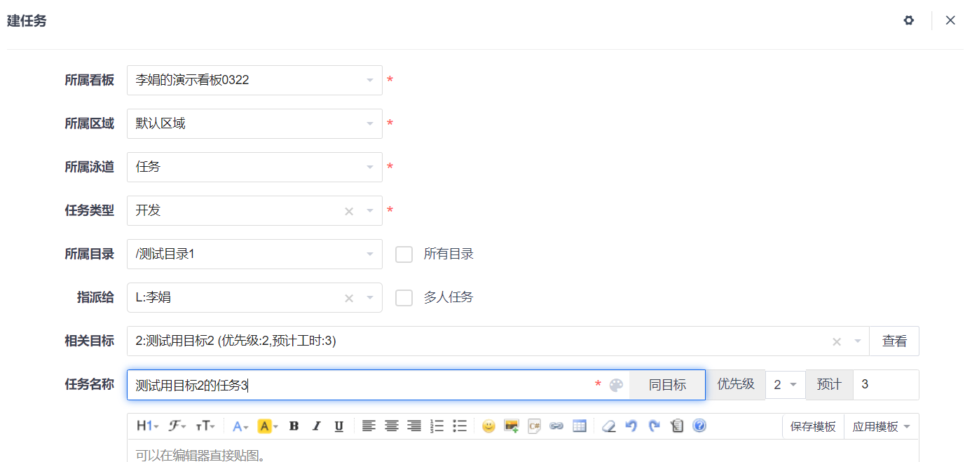 需要选择所属看板、区域、泳道、任务类型、名称等信息。
