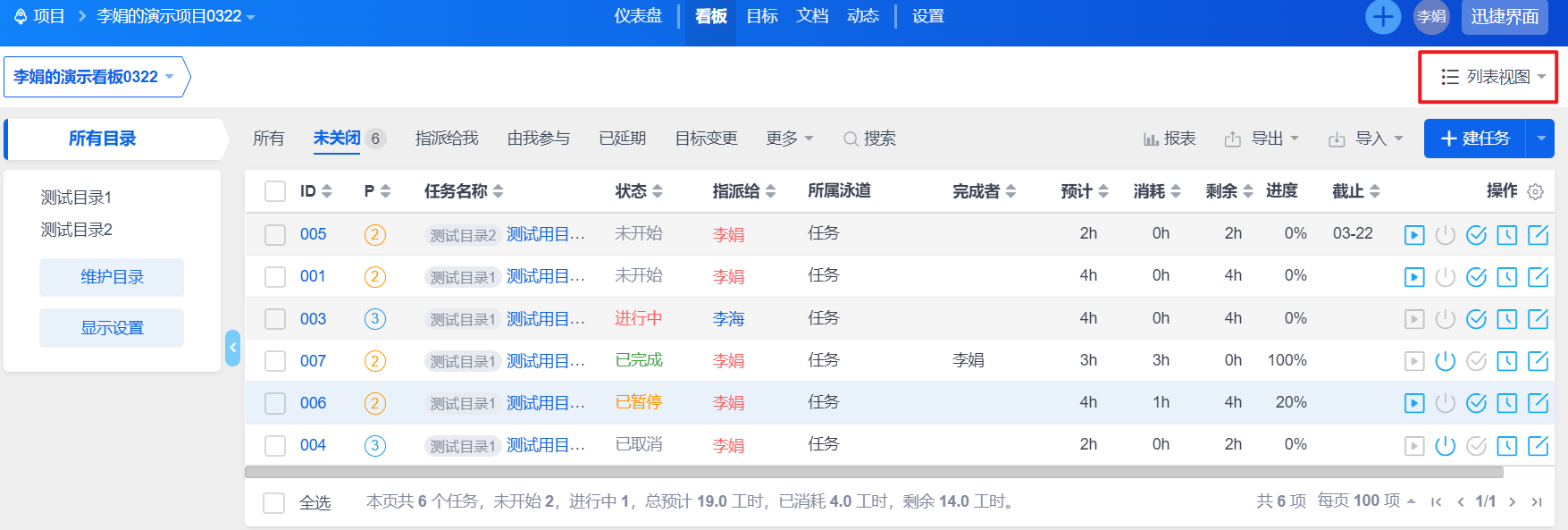 默认的任务泳道,看板列对应着的是任务的状态,可以直接拖拽任务卡片到对应的看板列中,来改变任务的状态。