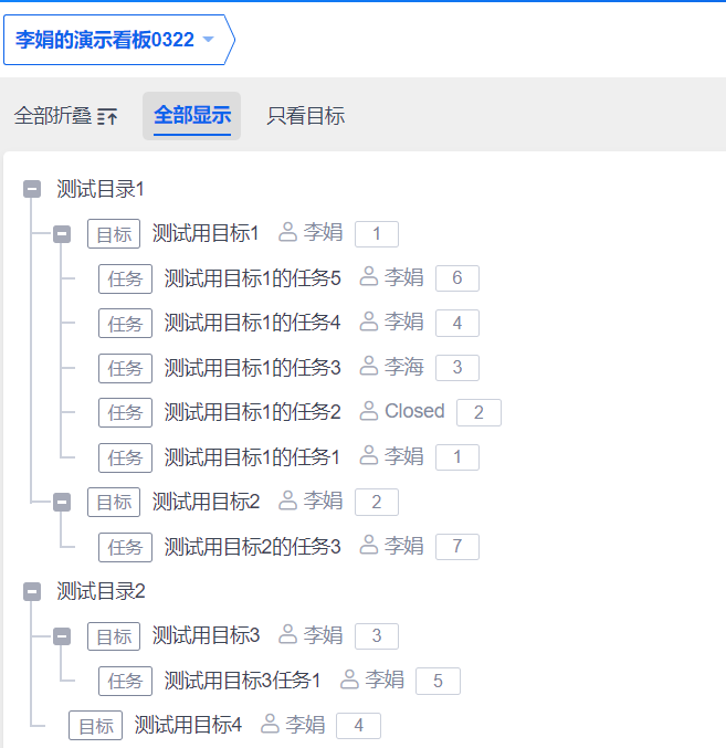 树状图查看时,默认全部显示,可以全部折叠、只看目标来查看任务和目标。