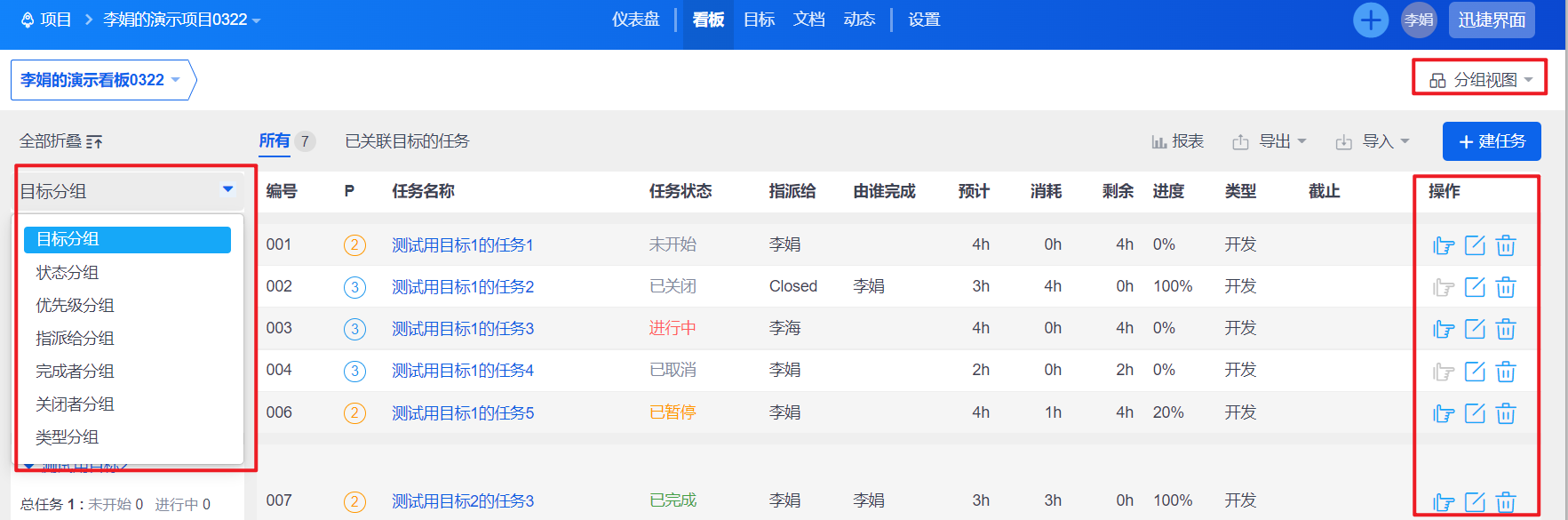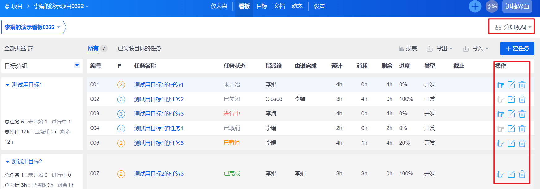 切换到分组视图查看时可以按照分组来查看目标和任务。