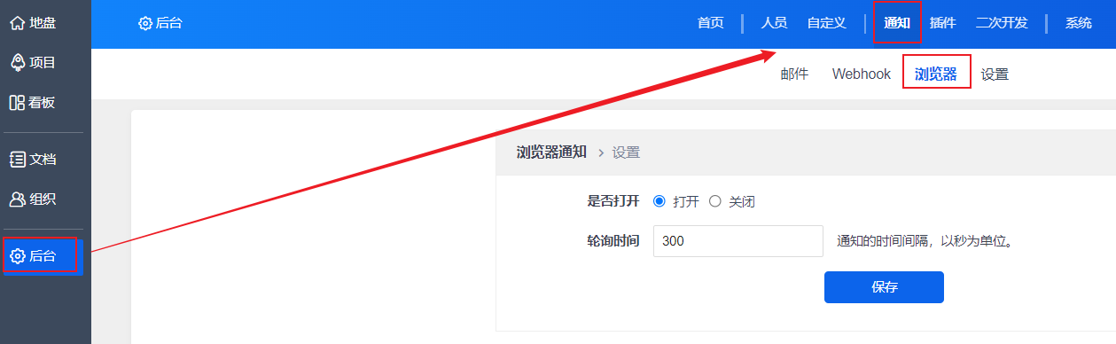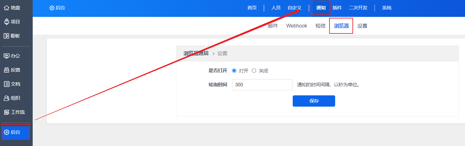 点击“后台”-“通知”-“浏览器”。如果没有显示浏览器通知设置,需要联系管理员到组织--权限里分配浏览器设置的权限。