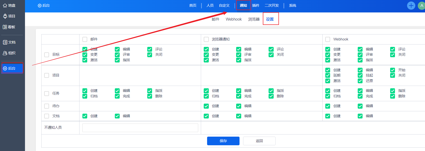 “后台”-“通知”-“设置”中,可以对邮件、Webhook和浏览器的通知触发动作进行设置。