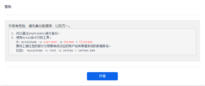 3. 执行升级程序假设禅道的访问路径是 http://192.168.1.99/zentao/,升级路径为http://192.168.1.99/zentao/upgrade.php。