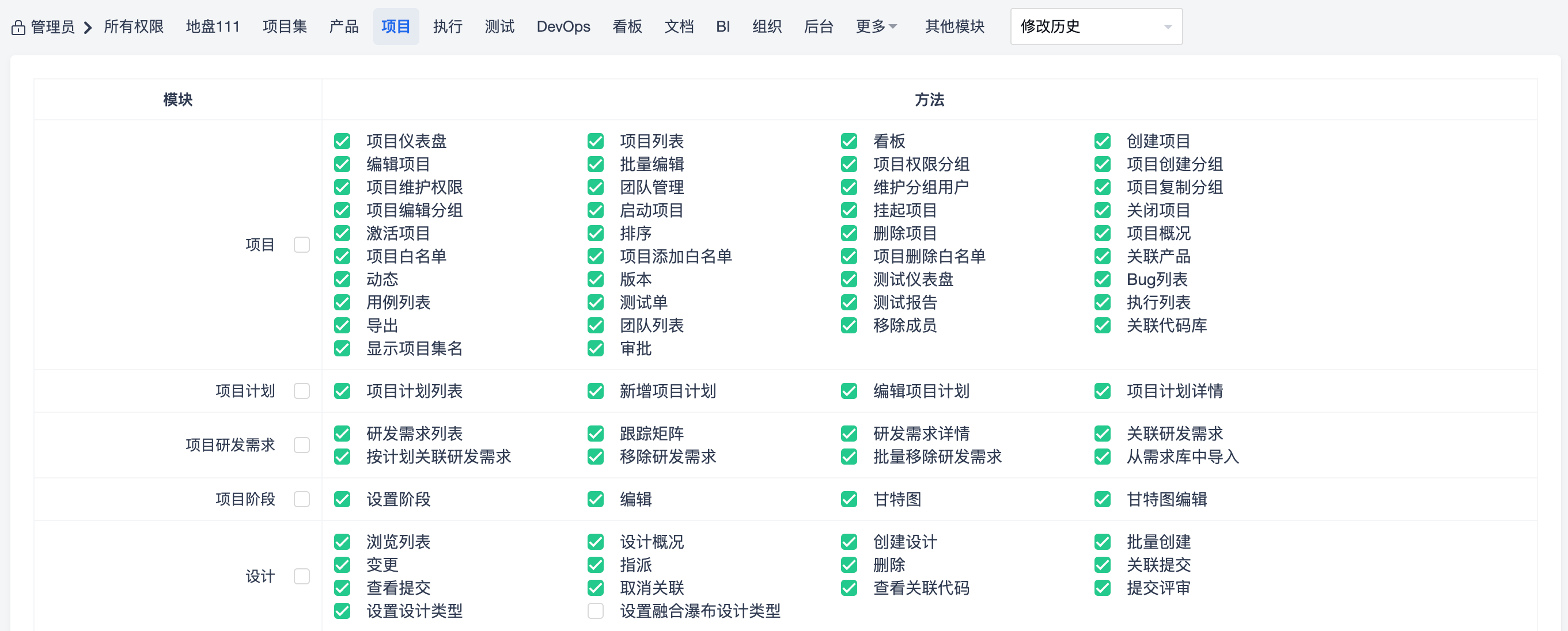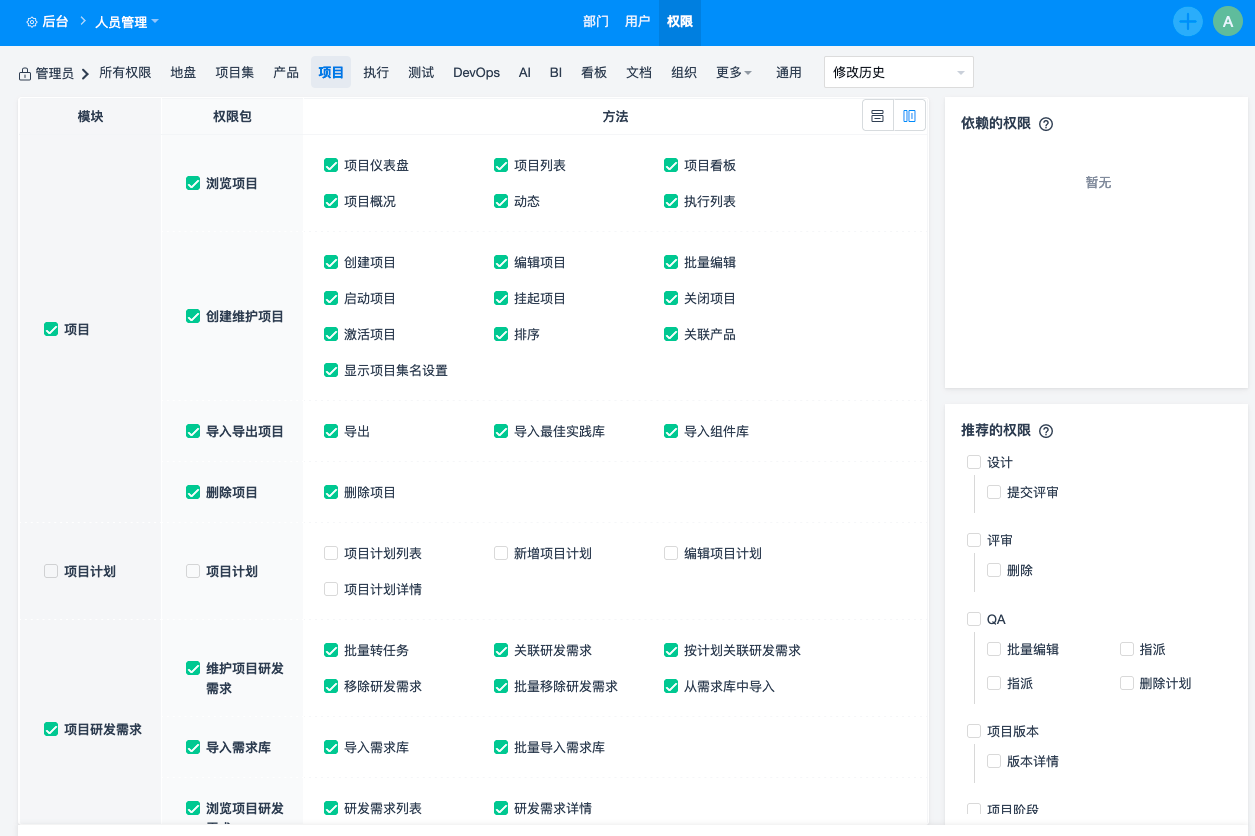 项目可以在“后台”-“人员管理”-“权限”中维护全局权限;也可以在“项目”-“设置”-“权限”里维护当前项目的权限。