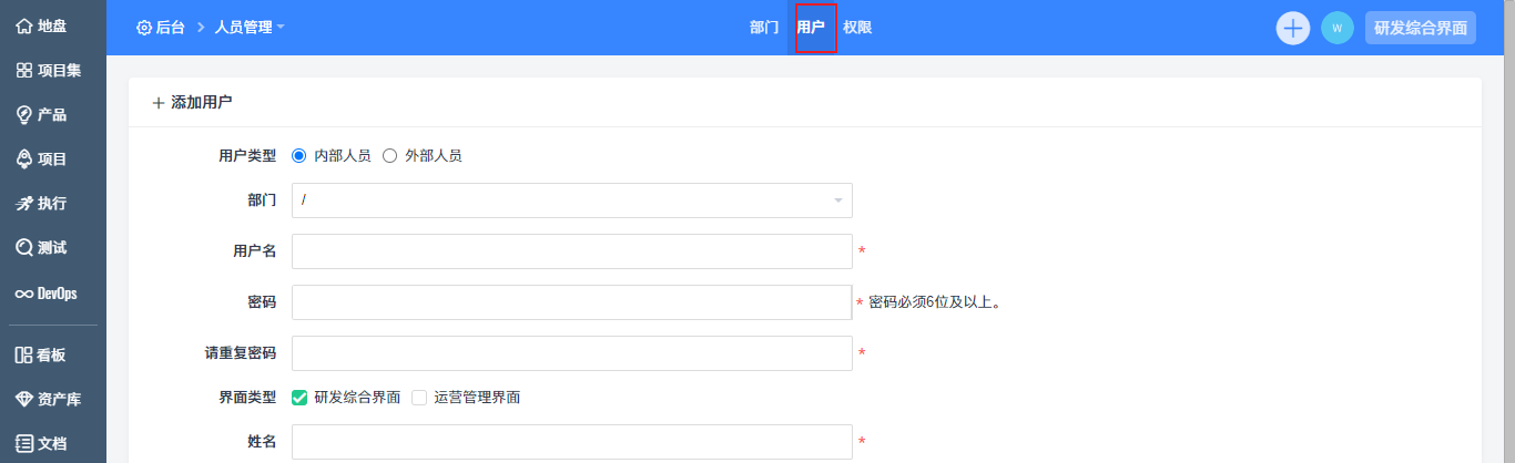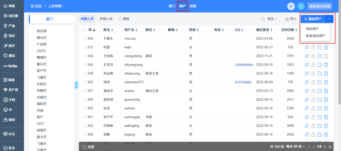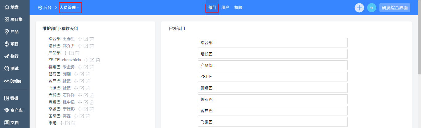 在添加用户之前,需要先维护部门。点击“后台”--“人员管理”--“部门”中,可以直接添加和维护部门。