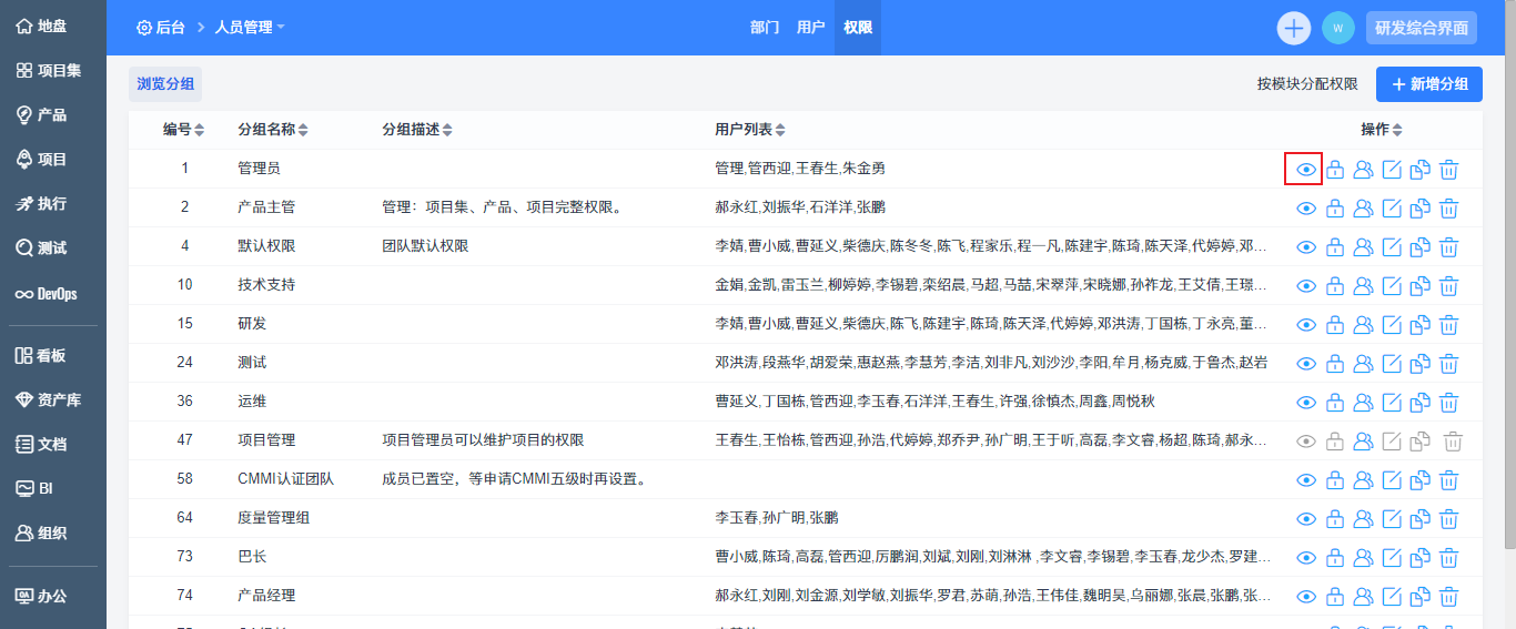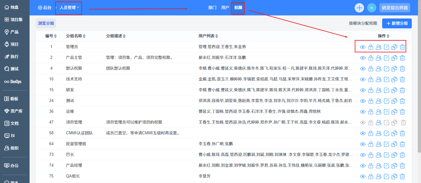 - 权限维护:设置分组成员可以操作的具体动作等所有在禅道中涉及的权限。