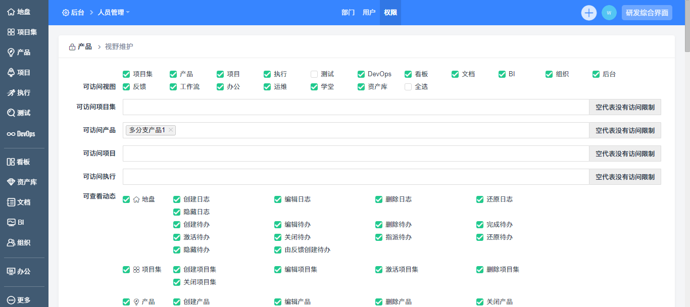 注:“空代表没有访问限制”时,按照产品、项目集、项目、执行设置的访问权限进行控制。