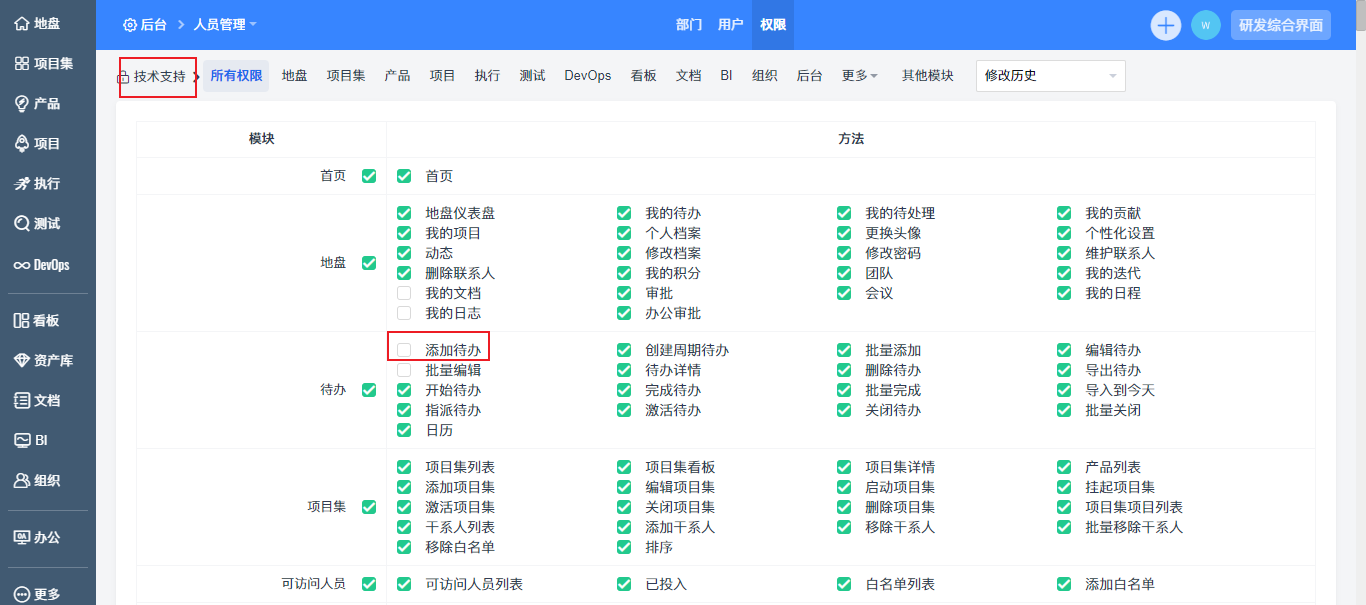 在“权限维护”页面,可以对禅道的模块和方法进行非常详细的权限设置。例如,将权限分组的“添加代办”勾选掉,那么该分组的成员登录禅道将无法进行添加代办的操作。