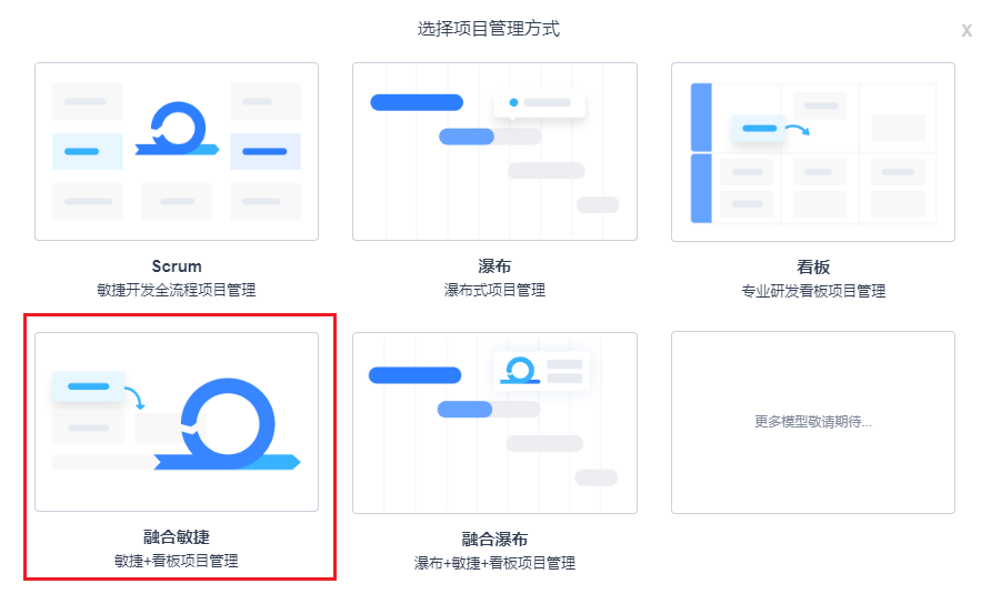 创建项目时,选择项目管理方式页面,点击选中融合敏捷。