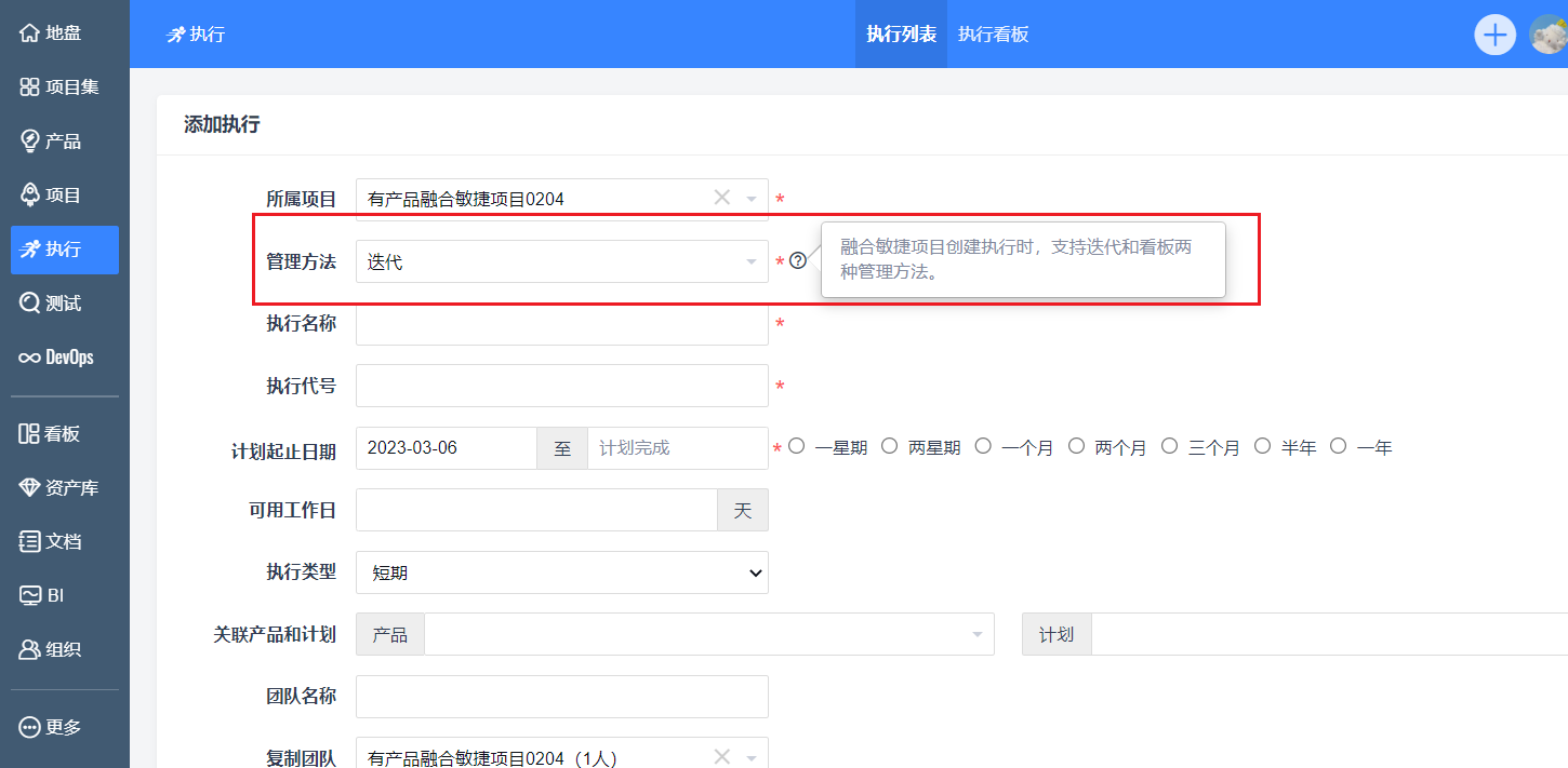 融合敏捷项目支持创建敏捷项目里的迭代以及看板项目里的看板。