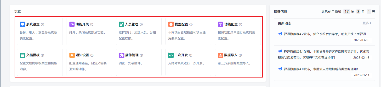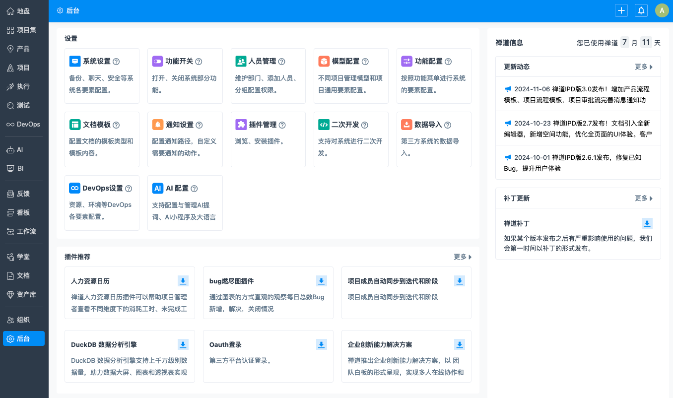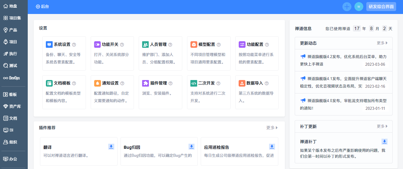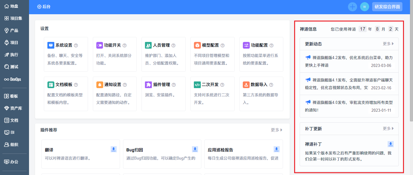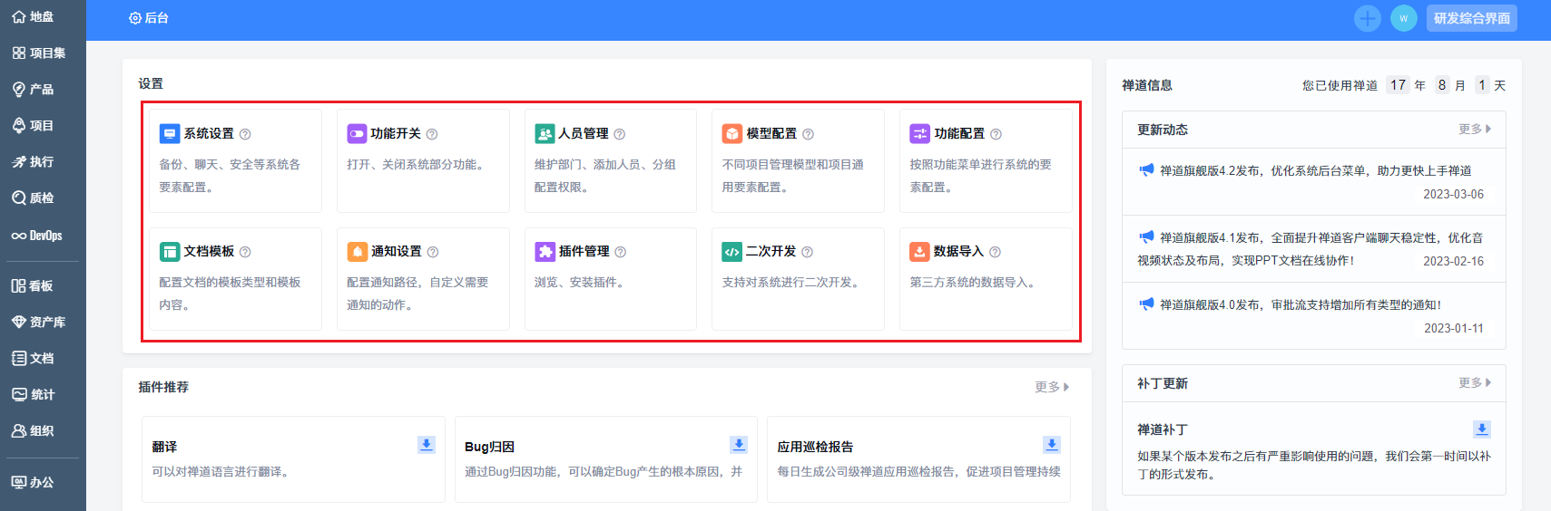 将后台的功能菜单入口整合到设置区块;增加禅道相关信息,在后台首页您可以获取禅道插件、动态等信息。