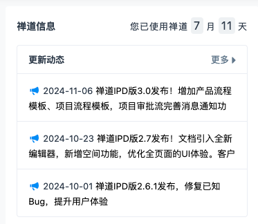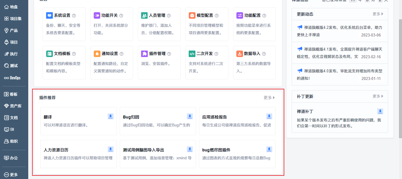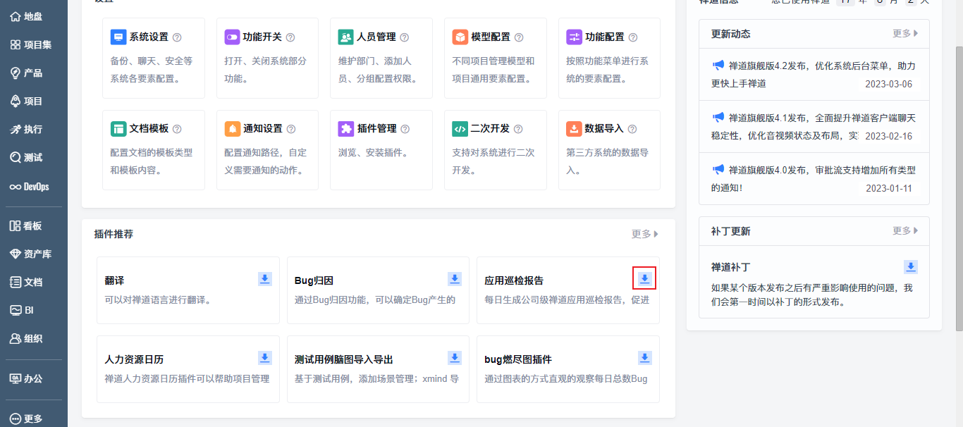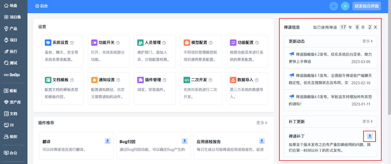 后台首页禅道信息区块展示禅道更新的动态,可以看到禅道发布的节奏;该区块还推荐适合当前版本的补丁,点击下载按钮到官网下载补丁,修复当前版本已知的bug;开源版还会展示更高级的版本信息,可以了解开源版没有覆盖的禅道功能。