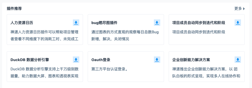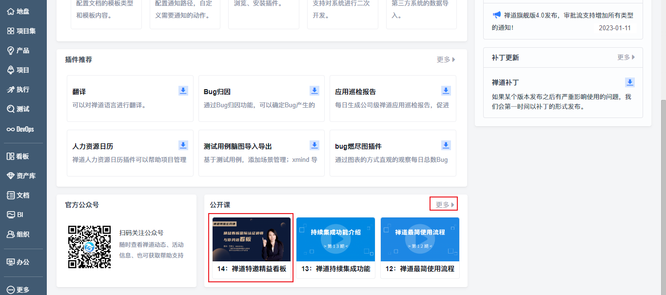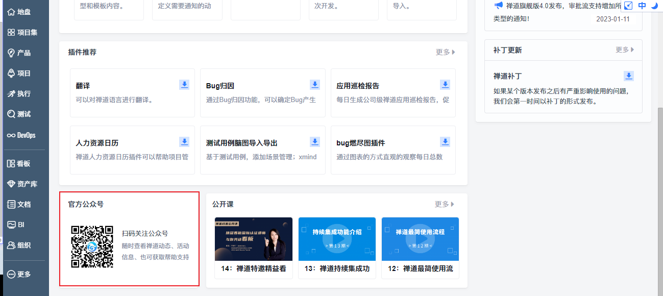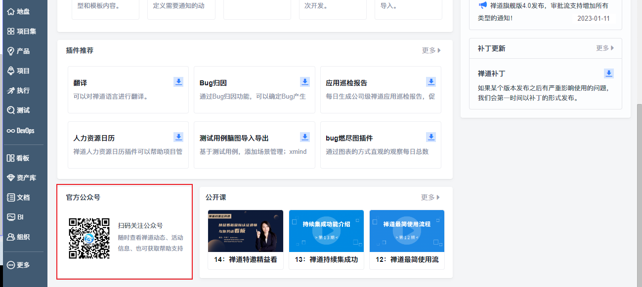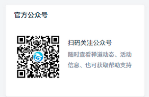 官方公众号区块提供官方公众号信息,扫码可以获得官方的使用帮助,也可以随时查看禅道动态、活动信息。