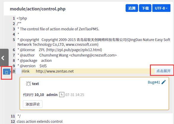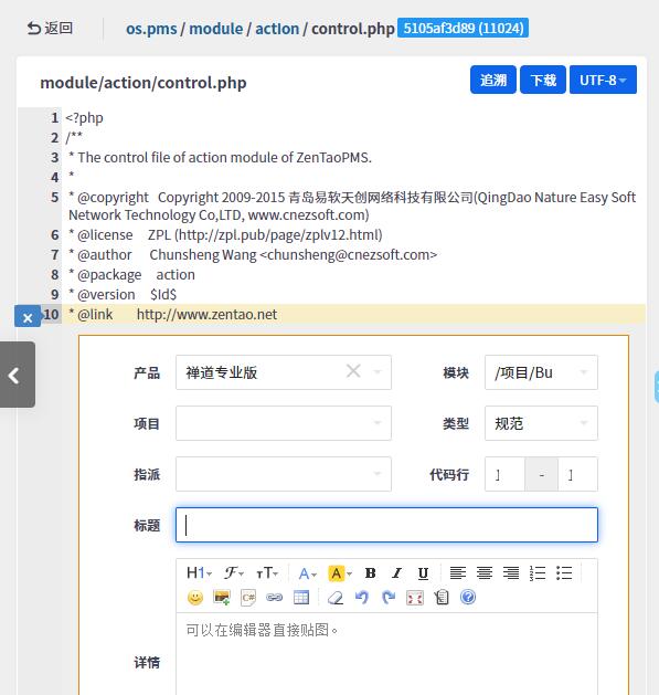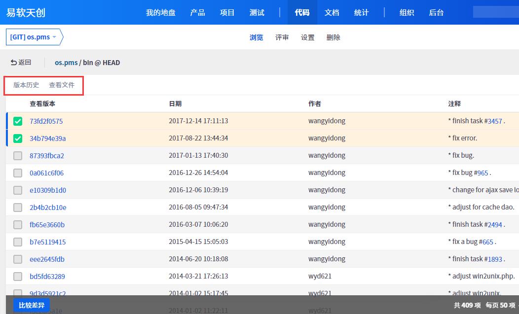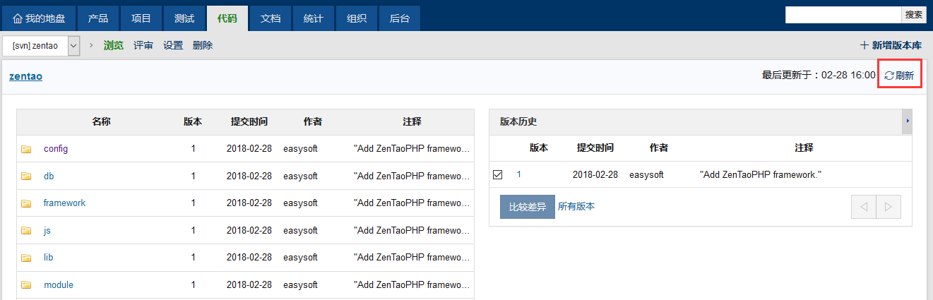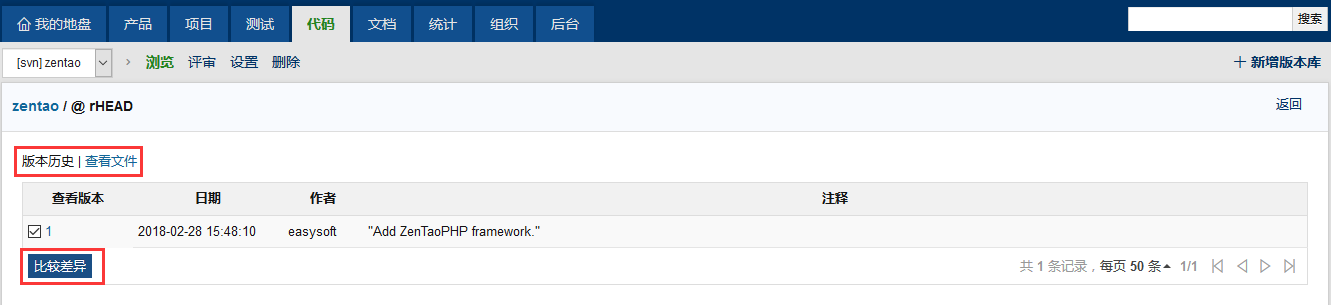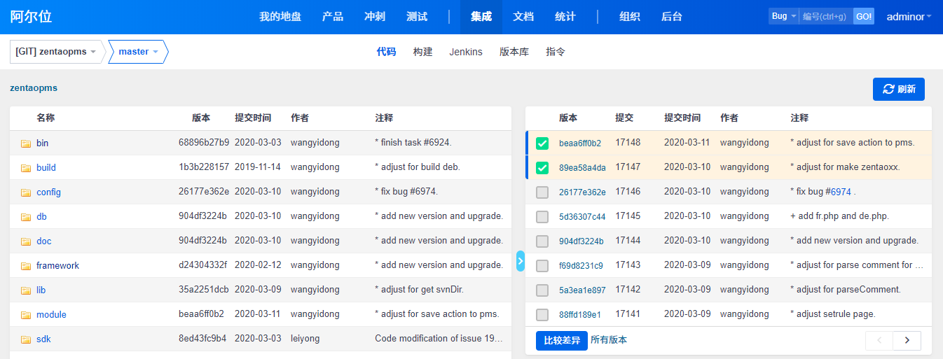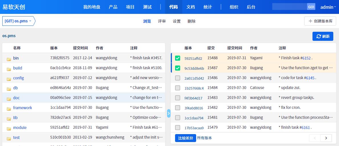 禅道企业版本提供了更加全面的SVN Git集成,可以通过web界面浏览源代码里面的文件目录,查看修复记录,进行比对等操作。以SVN为例:
