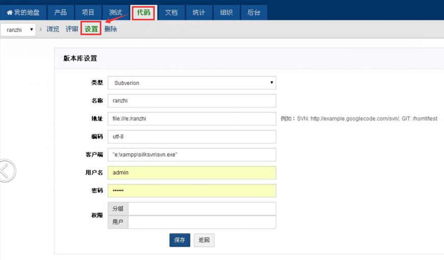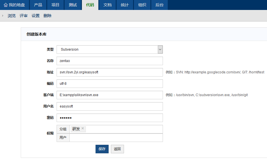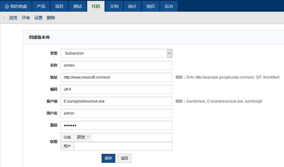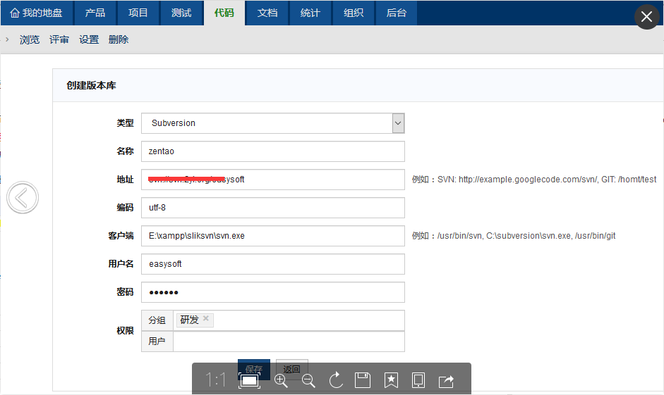 - 地址是subversion库的访问路径,比如http://zentaoms.goglecode.com/svn,不一定是根路径,可以是某一个下级路径。