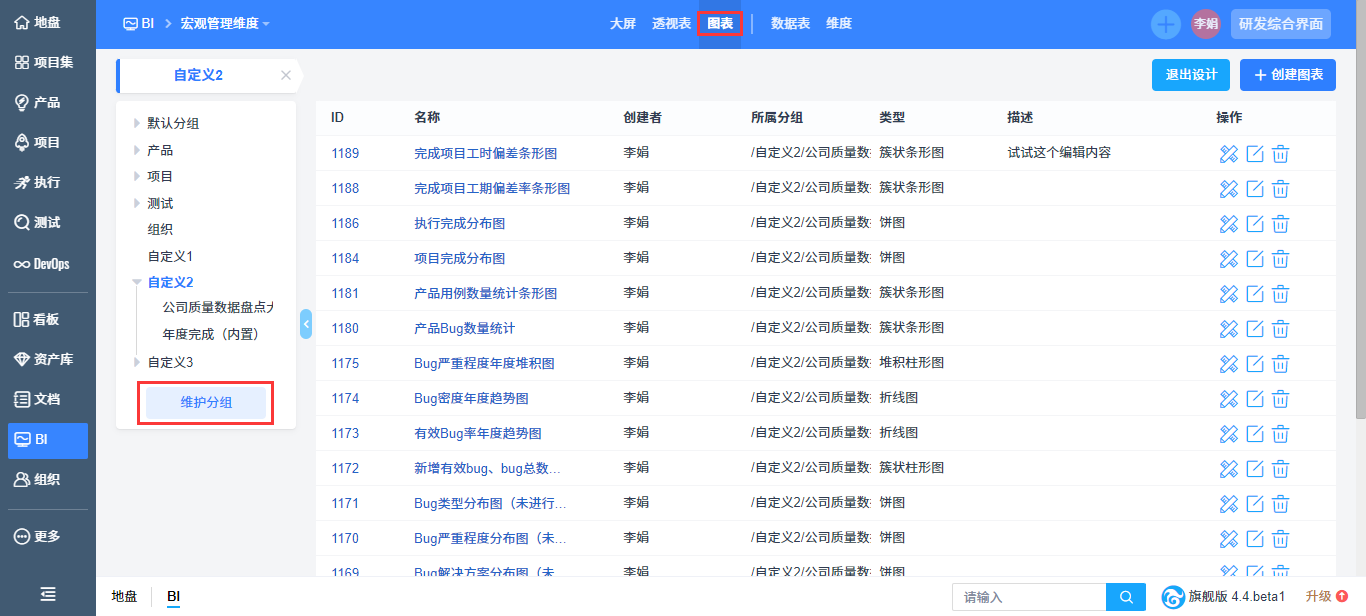 在“BI”-“图表”的设计管理页面中,可以对图表进行设计、编辑、删除的操作。