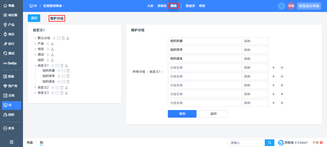 在“BI”-“图表”的设计管理页面中,点击维护分组按钮,进入维护分组页面,可以对分组进行增加、删除、编辑的操作。