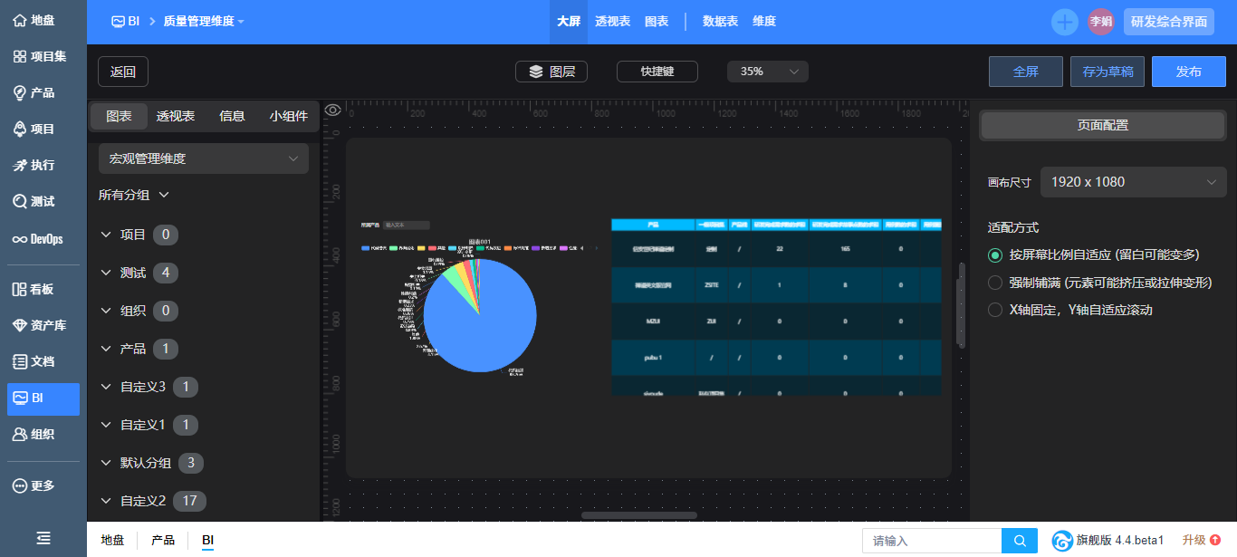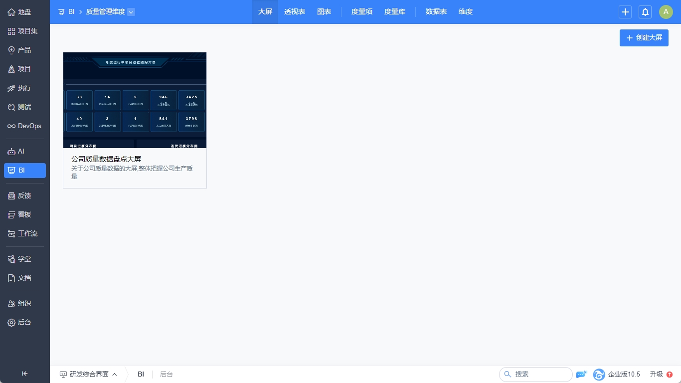 大屏(企业版8.4+)是禅道系统BI模块面向企业数据设计的可视化的专业功能,支持内置大屏的查看与自定义大屏的设计管理。用户可通过直观的拖拽操作集成图表、透视表、度量项等组件,快速构建动态数据看板,满足多场景下的数据展示需求。内置宏观管理、效能管理、质量管理三大维度,包含多张内置大屏。同时支持从零开始创建个性化大屏,实现灵活排版与参数配置。其核心能力包括: